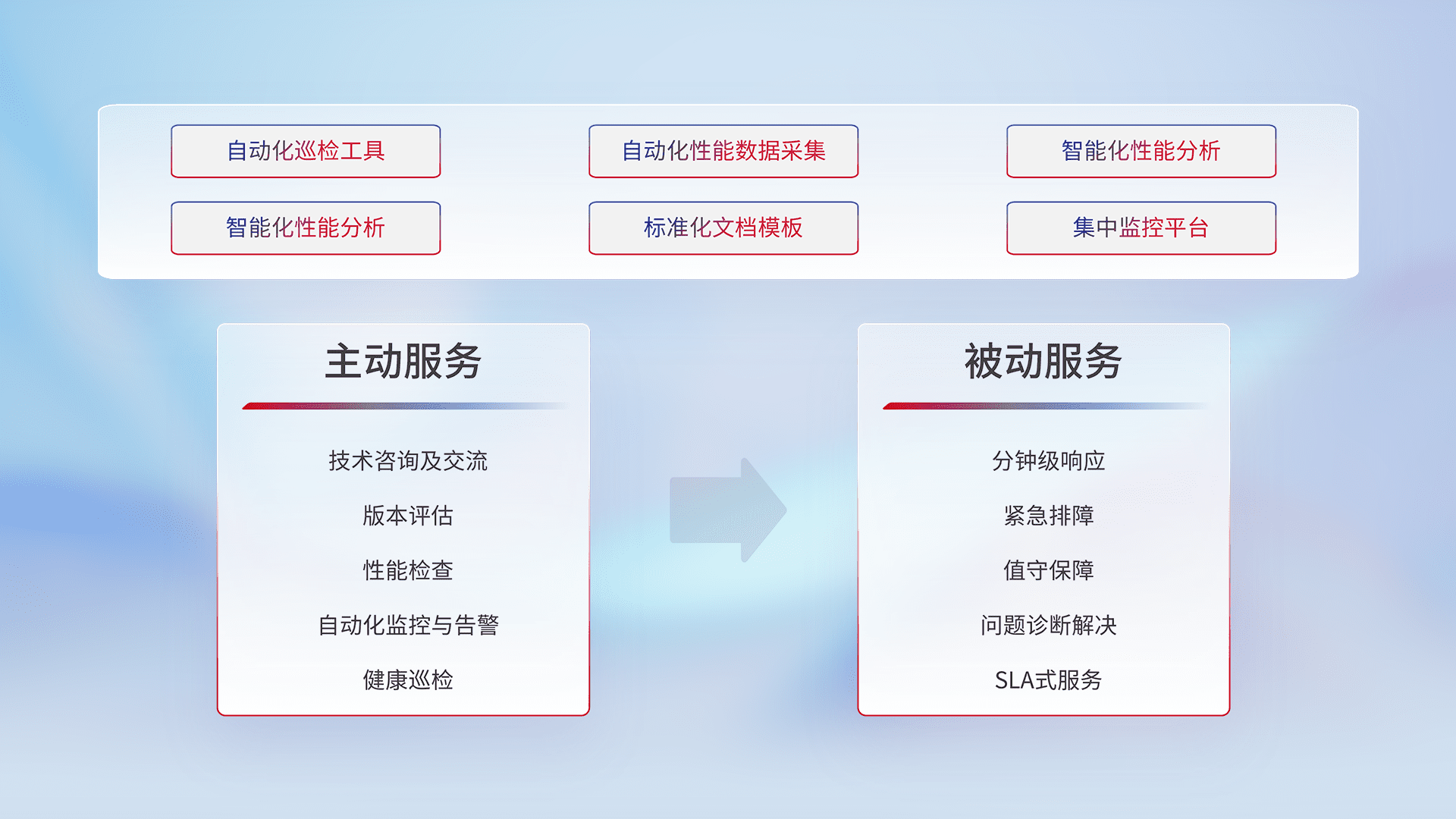 智能化工具和标准化文档,,,,保障服务质量,,,提供主动服务(包含技术咨询、、、、版本评估、、性能检查、、自动化监控与告警、、、、健康巡检)和被动服务包含(分钟级响应、、、、紧急排障、、、、值守保障、、、、问题诊断解决、、、SLA服务)。。